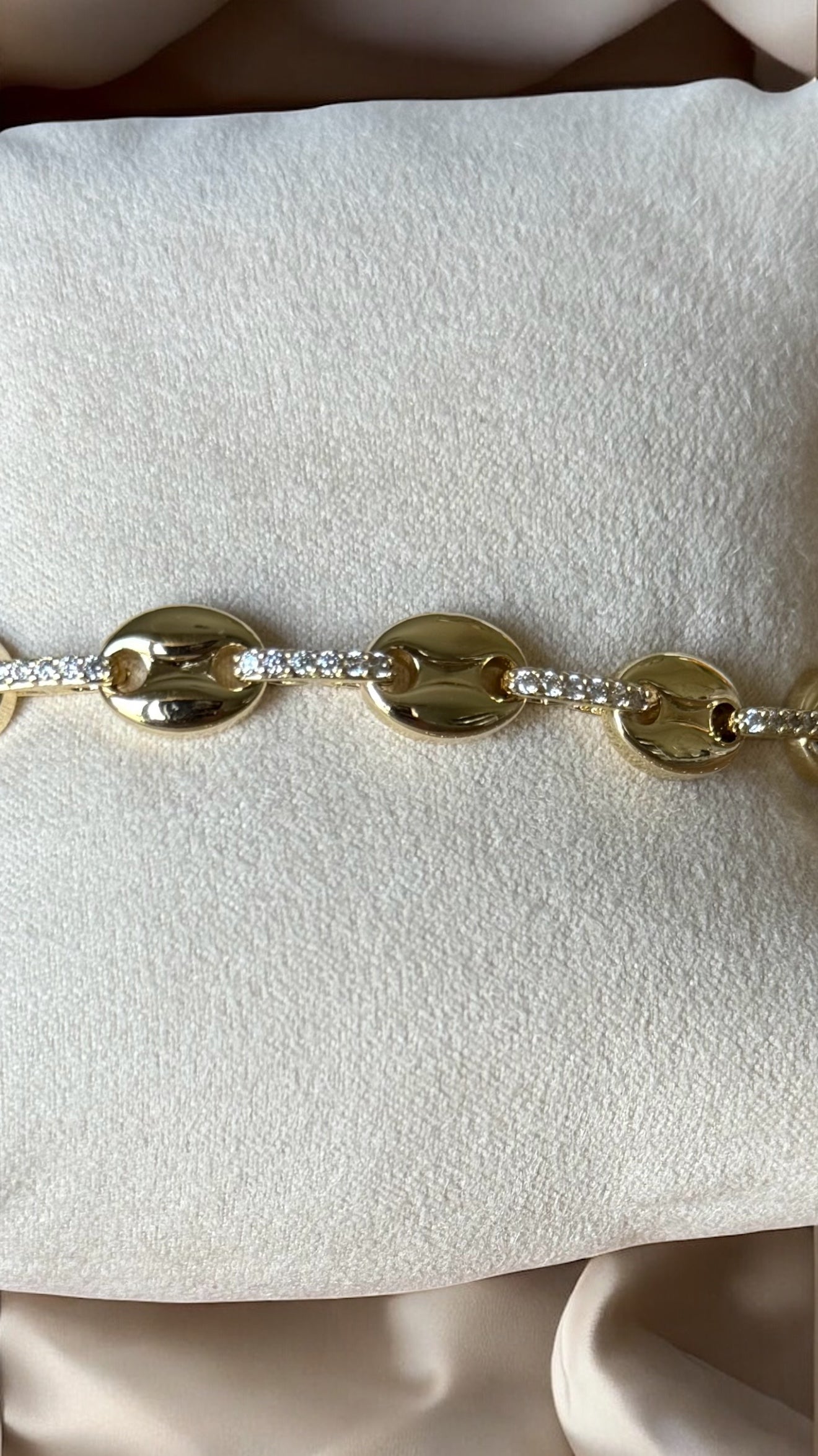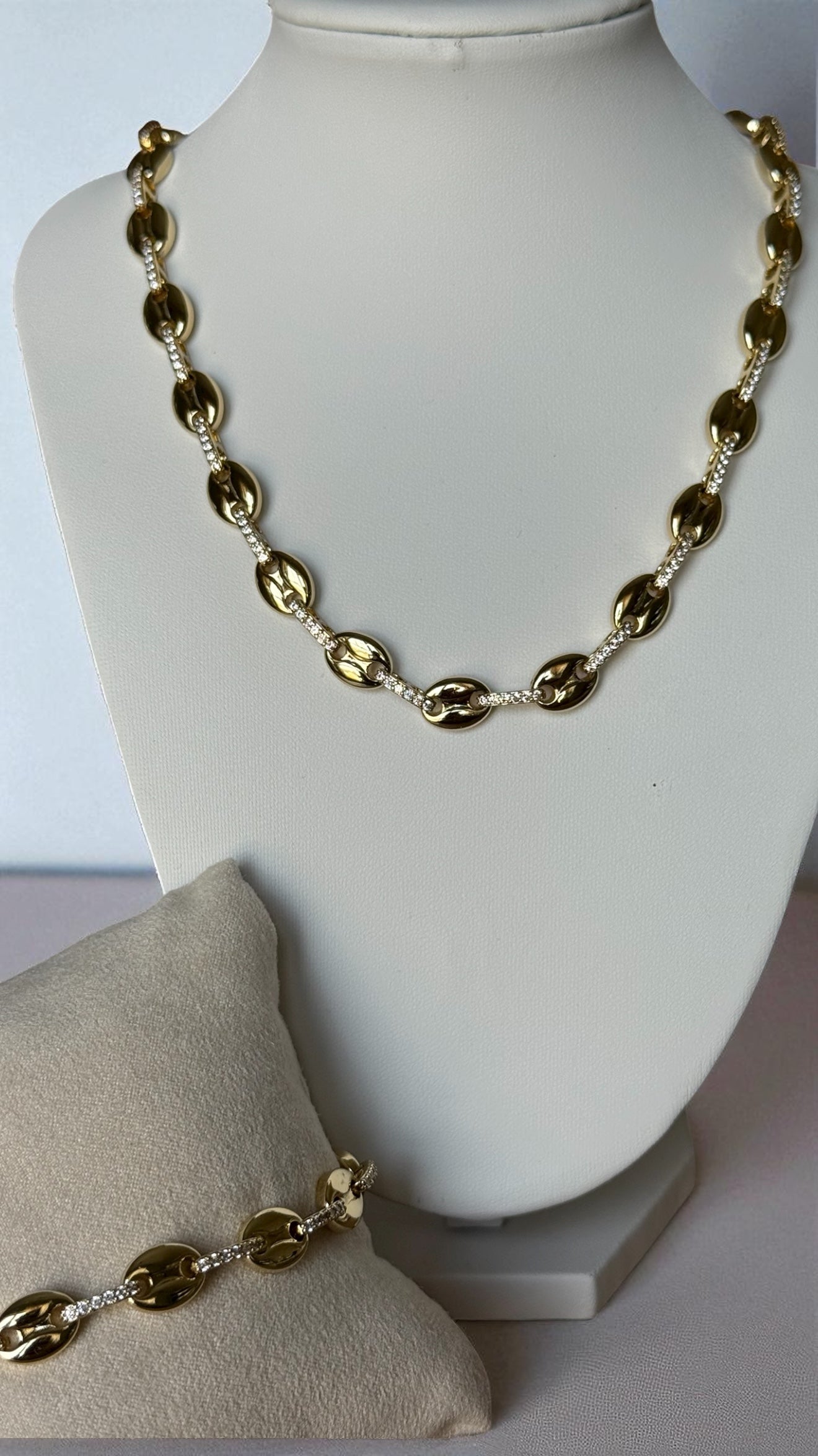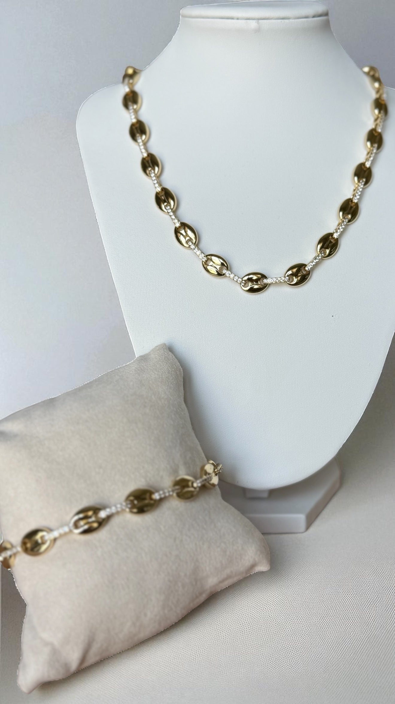 A bold and timeless design inspired by the classic coffee bean link. This set features a striking necklace and matching bracelet with alternating polished and textured links for a radiant shine. Perfect for making a statement while keeping it effortlessly elegant.