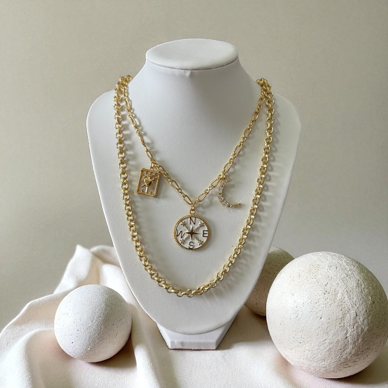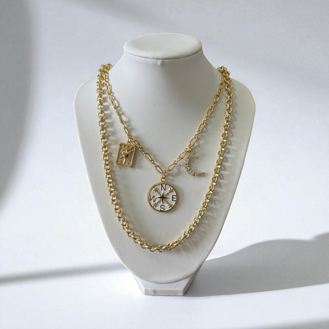This is a one of a kind custom design, only 1 available. The set includes two versatile necklaces: a 17” charm necklace featuring a compass, crescent moon, and angel frame for guidance and protection, and a 22” classic rolo chain. Wear them layered together for a bold statement or separately for a minimalist touch. A truly unique piece designed to