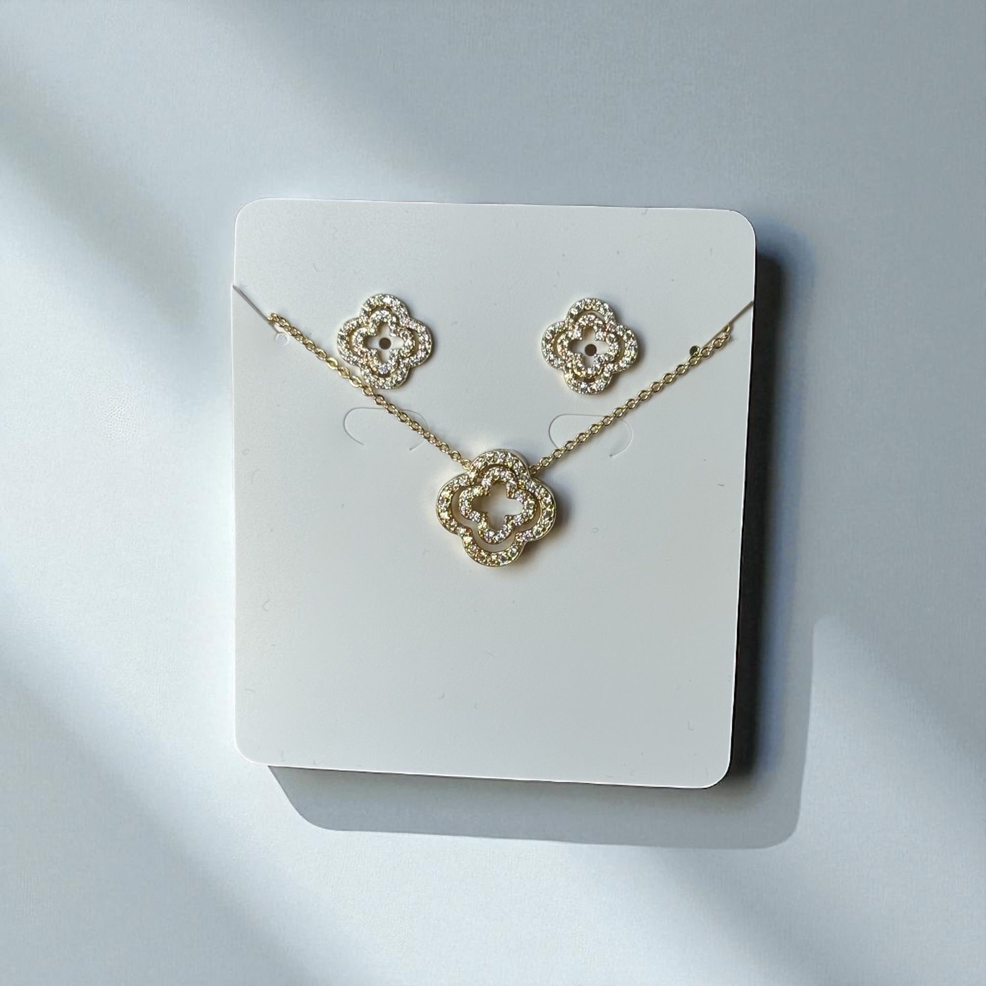 this sparkling clover set includes a delicate necklace and matching stud earrings. The shimmering stones highlight the graceful floral silhouette, making it the perfect piece for both everyday sophistication and special occasions.
