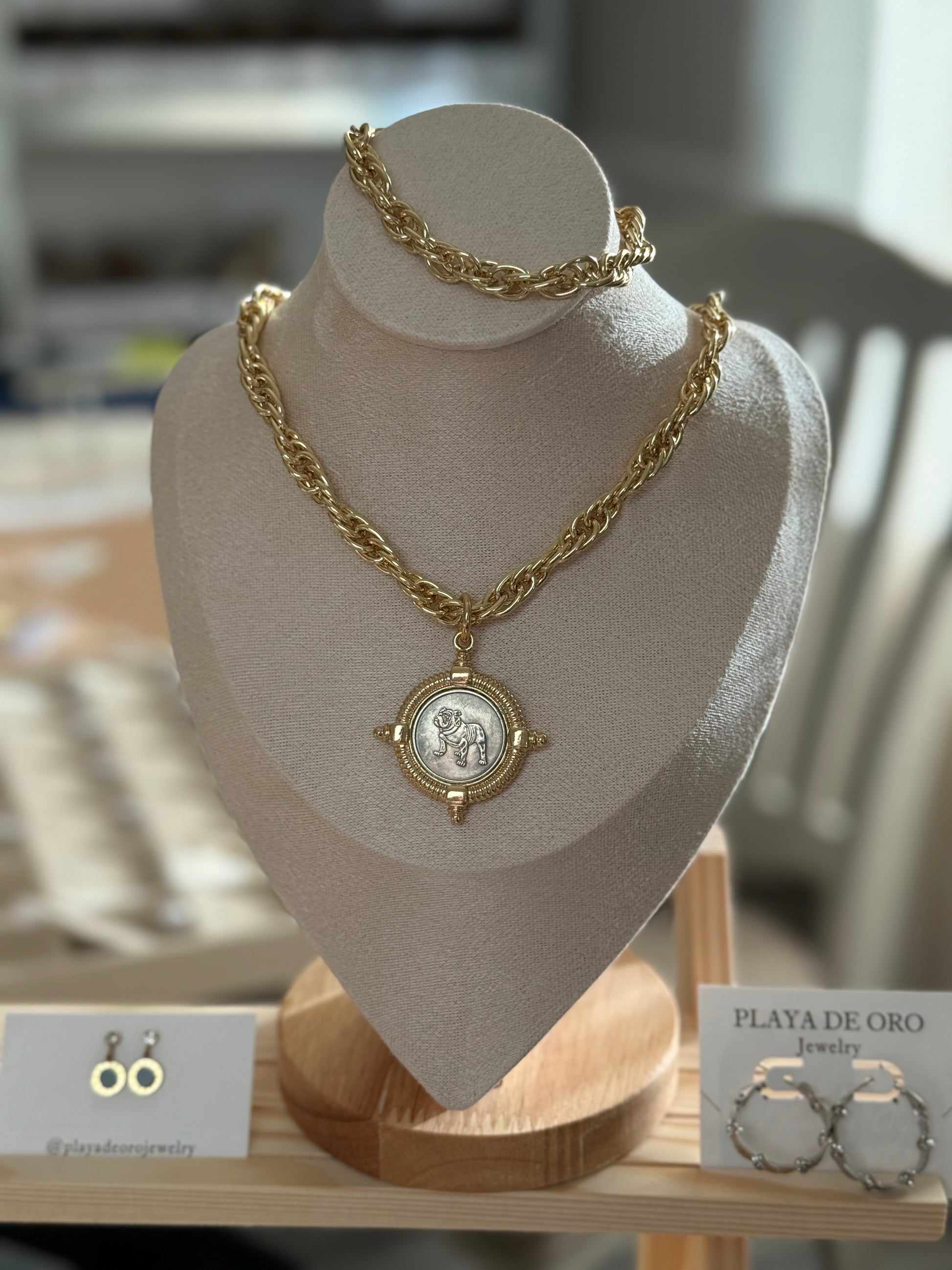 Go Dawgs! Statement Chain Set: This bold, gold-tone chain set makes a powerful statement. The chunky curb-link necklace proudly features a substantial Georgia Bulldog medallion pendant. The pendant's classic, antique-coin design, framed by pointed gold accents, celebrates the 'Red and Black' with a subtle, yet powerful Bulldog icon at its center. A matching, solid gold-tone chain bracelet completes this spirited, game-day-ready look.