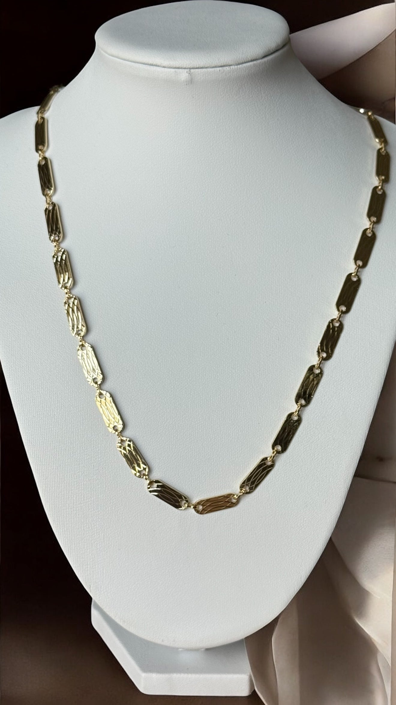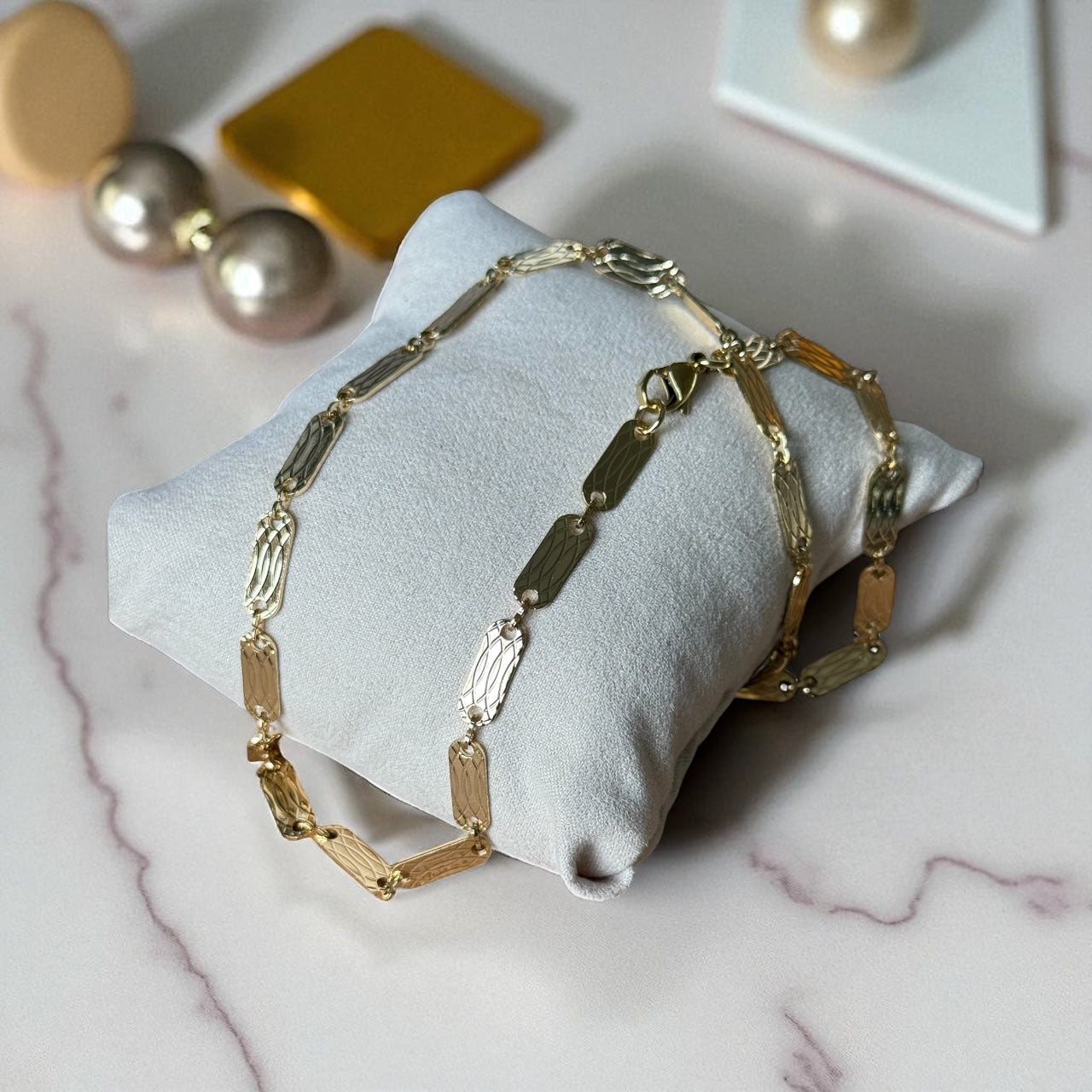 A timeless and refined piece designed to elevate any look. This 45 cm necklace features elongated textured links with a delicate shine, creating a sophisticated yet versatile style. Perfect for everyday wear or special occasions, it’s a classic staple every jewelry collection needs.